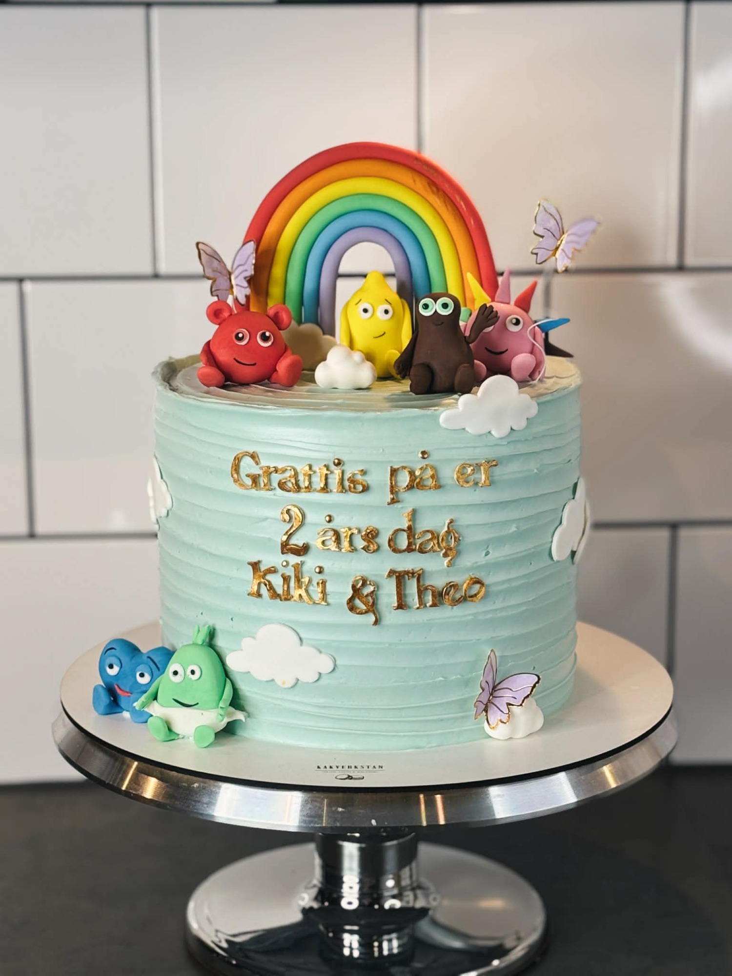 Saftiga sockerkaksbottnar i regnbågens färger med syrlig färskostfrosting. Täcks med marängsmörkräm