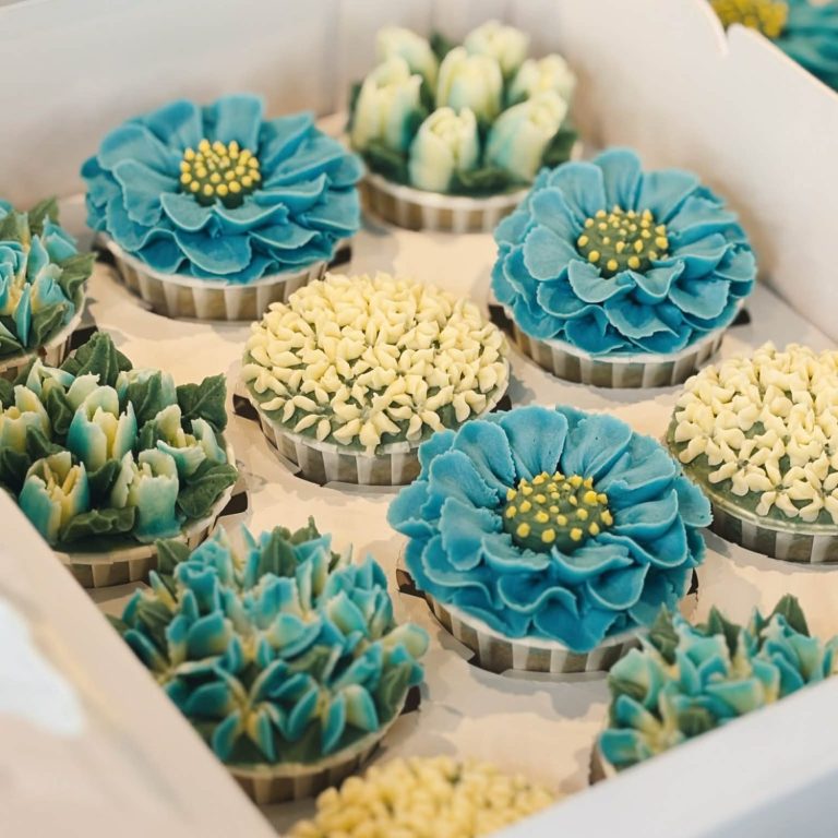 alla blomcupcakes spritsas med vaniljsmörkräm
