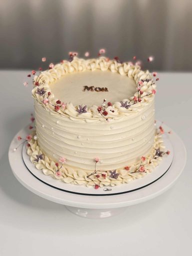 Vaniljbottnar, hallonganache, hallonkompott och vispad vaniljpannacotta. Täcks med marängsmörkräm